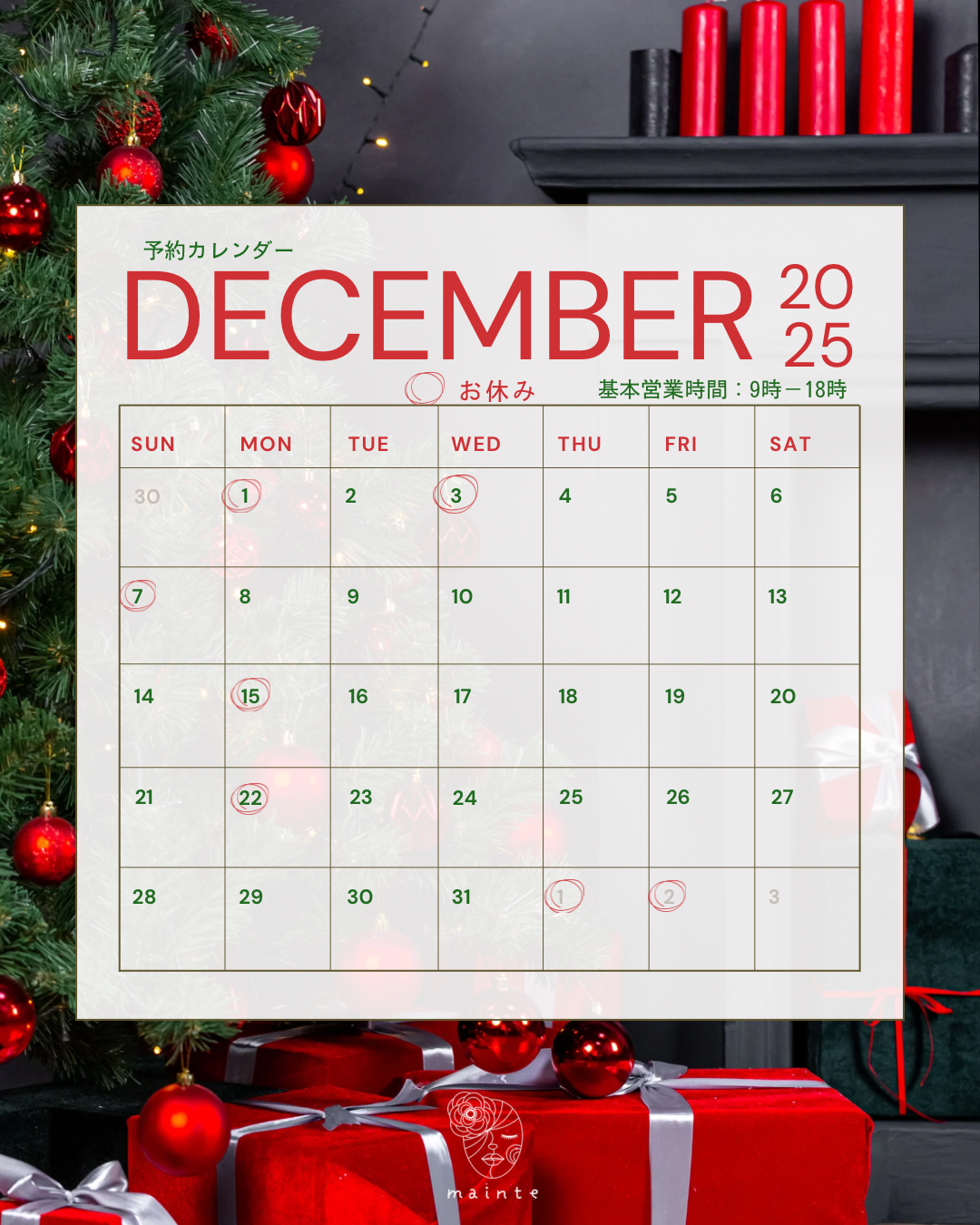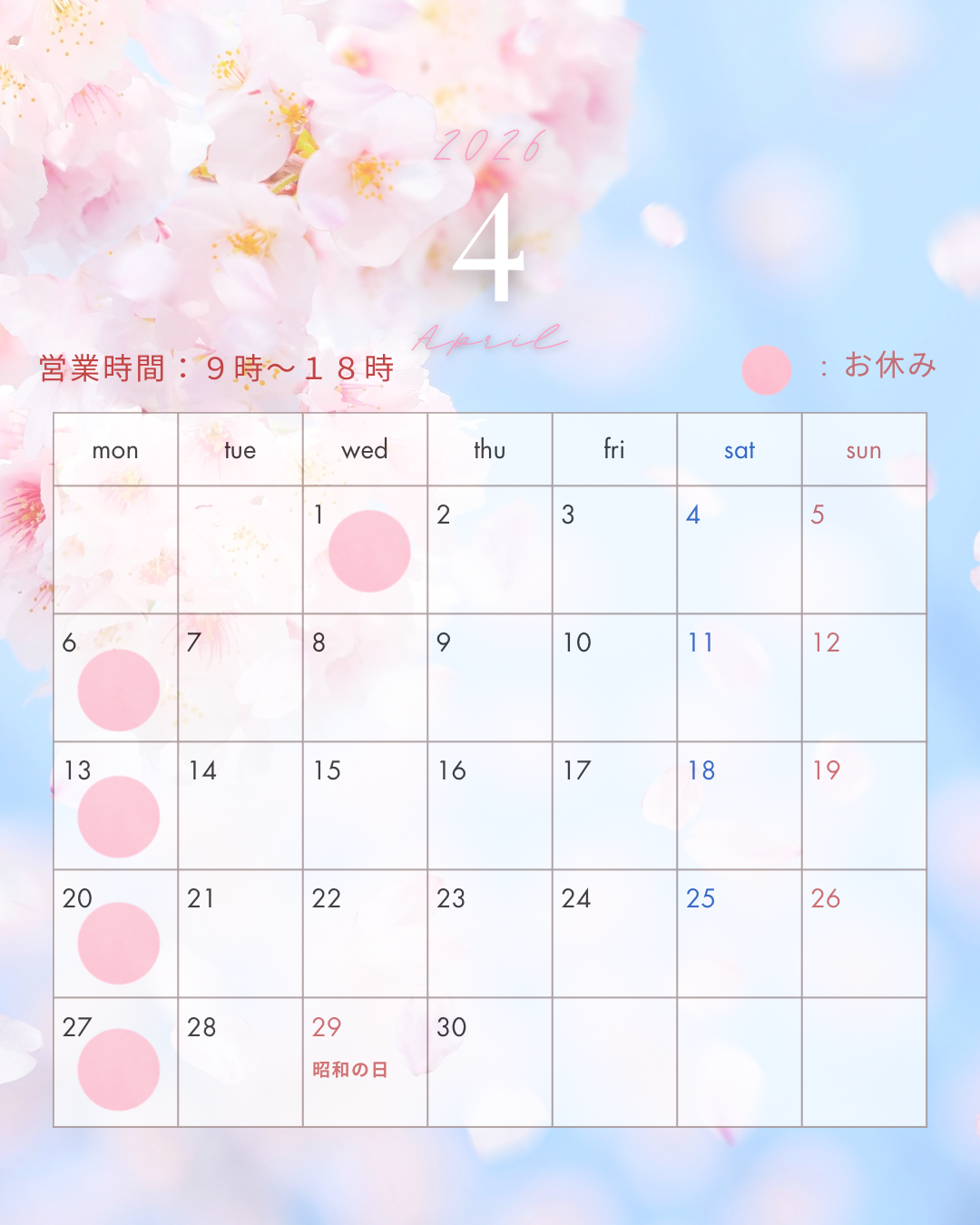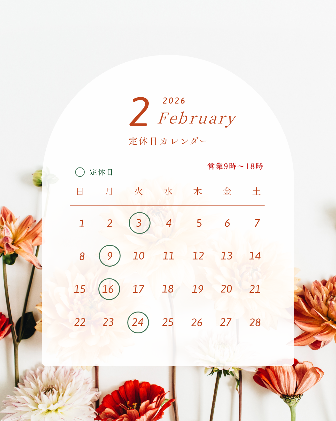 2026年2月は3日(火)9日(月)16日(月)24日(火)がお休みになっています。